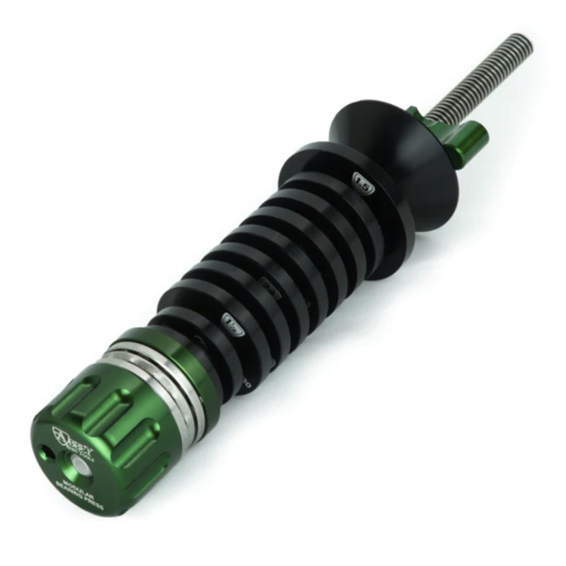 The Team Issue Press mantiene el Quick Nut de la prensa grande, una pequeña tuerca que te permite deslizarla y luego encajarla en su lugar en la rosca. Mucho más rápido, sin riesgo de pellizco y seguro. El kit incluye un cabezal de prensa completo sin manijas, eje de prensa de 12", tuerca rápida y los siguientes drifts: Hecho en Bend Oregon. PF30/1.125" juego de dirección drifts de pedalier de 24mm, para pedaliers compatibles con shimano drift de pedalier de 22mm, drift único para pedalier GXP lado no motriz drift de pedalier de 28.9mm, para SRAM DUB drift 6806 para pedaliers BB30 drift de juego de dirección de 1.5" cono de centrado Los drifts adicionales están en la página de rodamientos y los ejes de prensa más largos junto con las piezas de servicio están disponibles en la página de piezas. Siempre recomendamos instalar los rodamientos de uno en uno para asegurarse de que entren rectos y no dañen los rodamientos, componentes o las herramientas. Use el cono de centrado en el lado vacío del buje/cuadro/articulación para mantener la prensa concéntrica con el orificio.