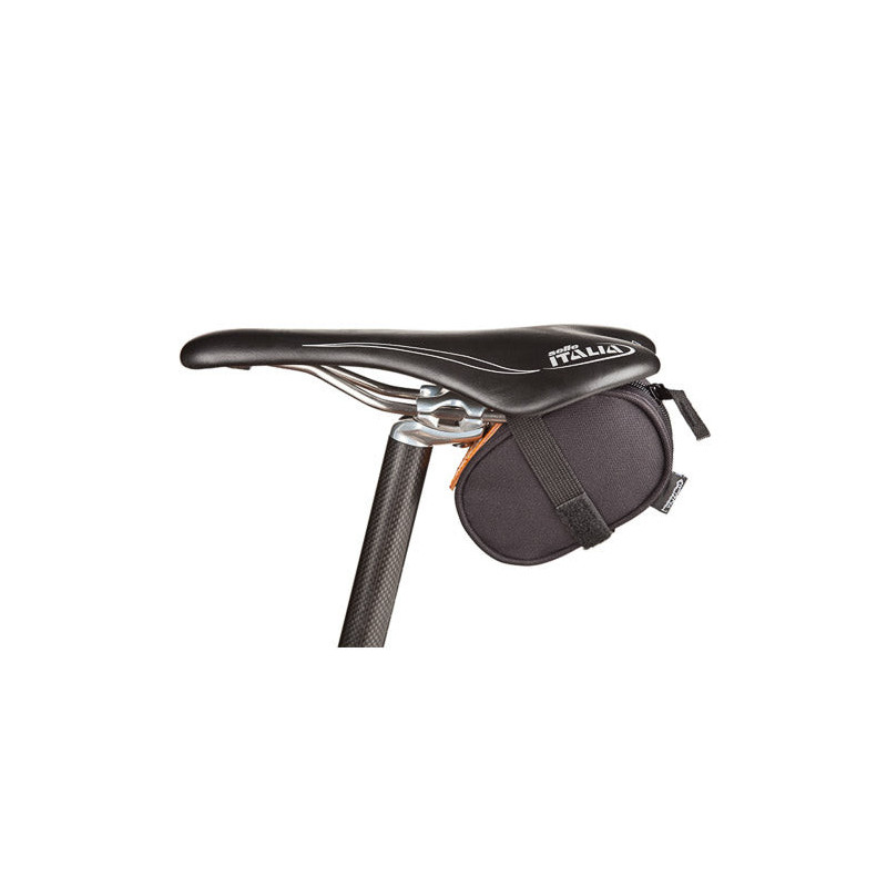 La bolsa Dual recibe este nombre porque puede contener dos cámaras de aire 700c, dos cartuchos de gas y una válvula, con espacio de sobra. También puede alojar una cámara de aire MTB y un cartucho de gas sin ningún problema. El refuerzo de cuero impide que el collarín de ajuste de la tija de sillín perfore las cámaras de aire. La sencilla correa de velcro está cosida en doble grosor para una mejor sujeción y un mantenimiento óptimo de la bolsa. 573 cm³.