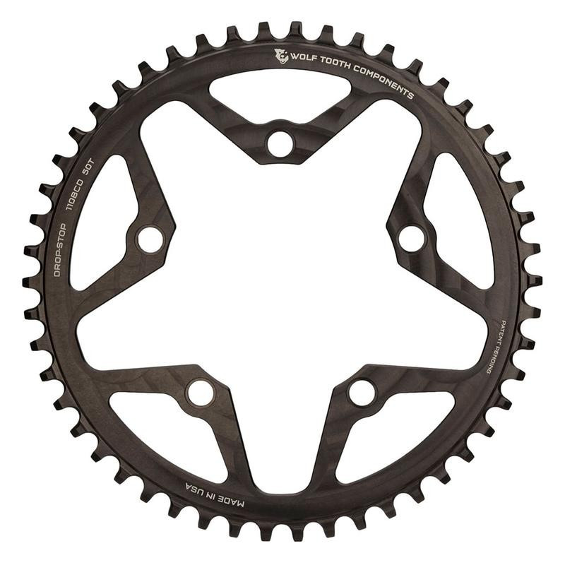 - Tecnologia Drop Stop. Sul pignone largo/stretto brevettato di Wolf Tooth, il lato largo del dente ha un contatto massimo sul lato di traino, il che distribuisce il carico e migliora la durata del pignone. Il lato stretto consente lo scarico di fango e detriti, riducendo così l'attrito.